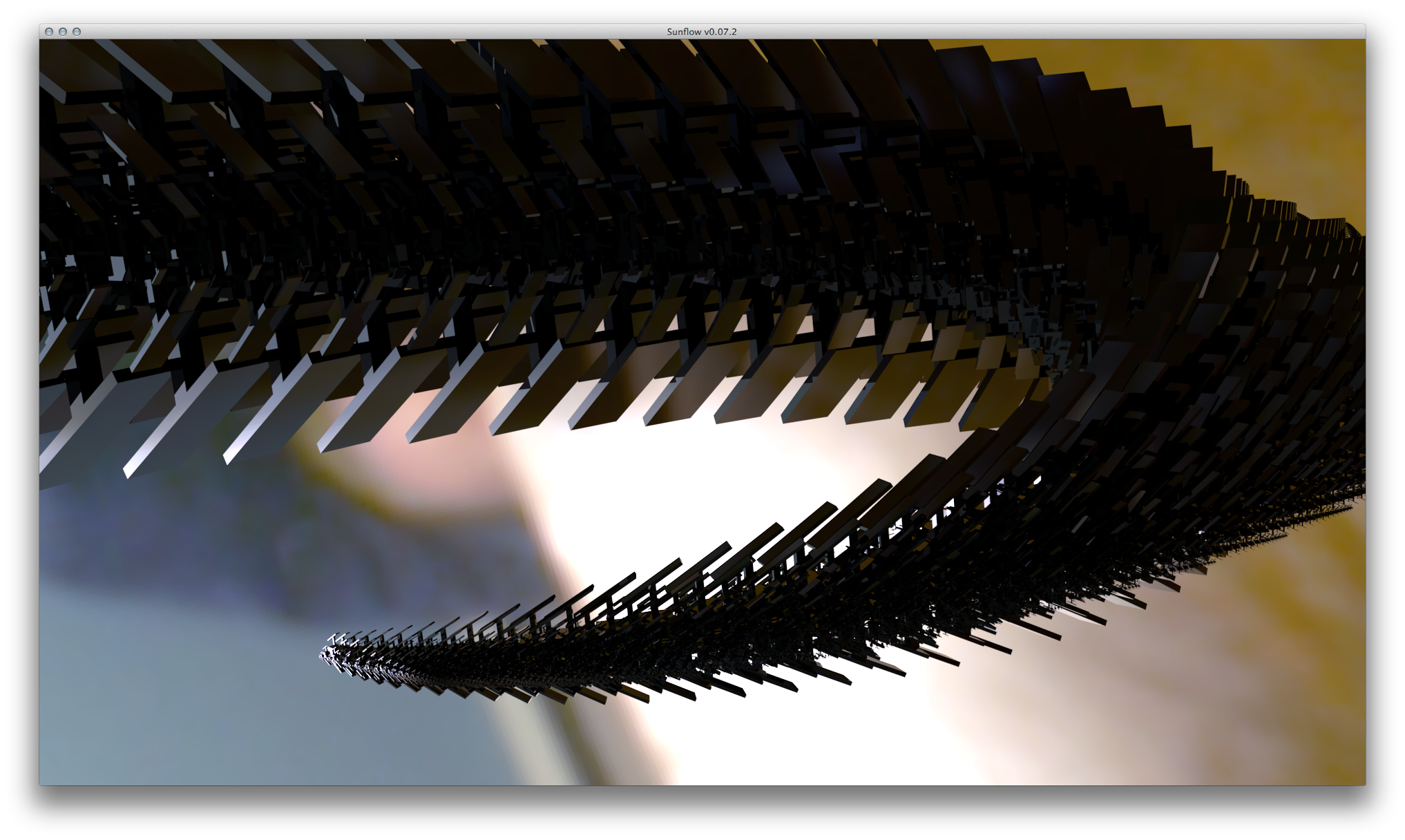 Here are my continued experiments with structure synth and sunflow. By invoking the built in sunflow export templates and then modifying the resultant .sc file by hand I can add some of sunflow's more advanced features like Image Based Lighting, seen here.