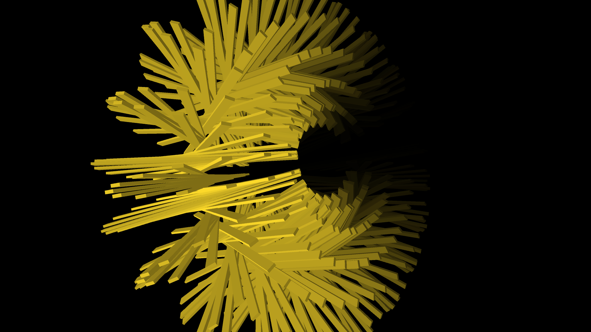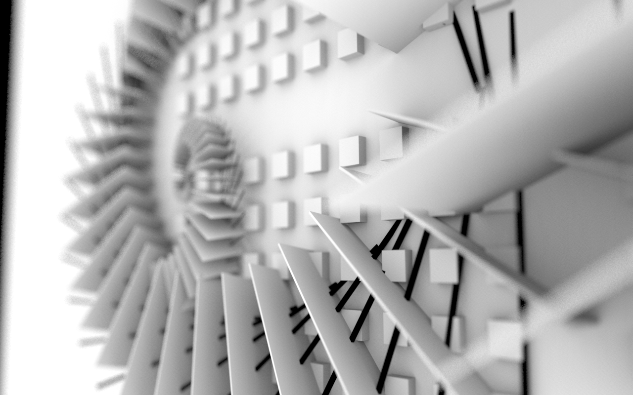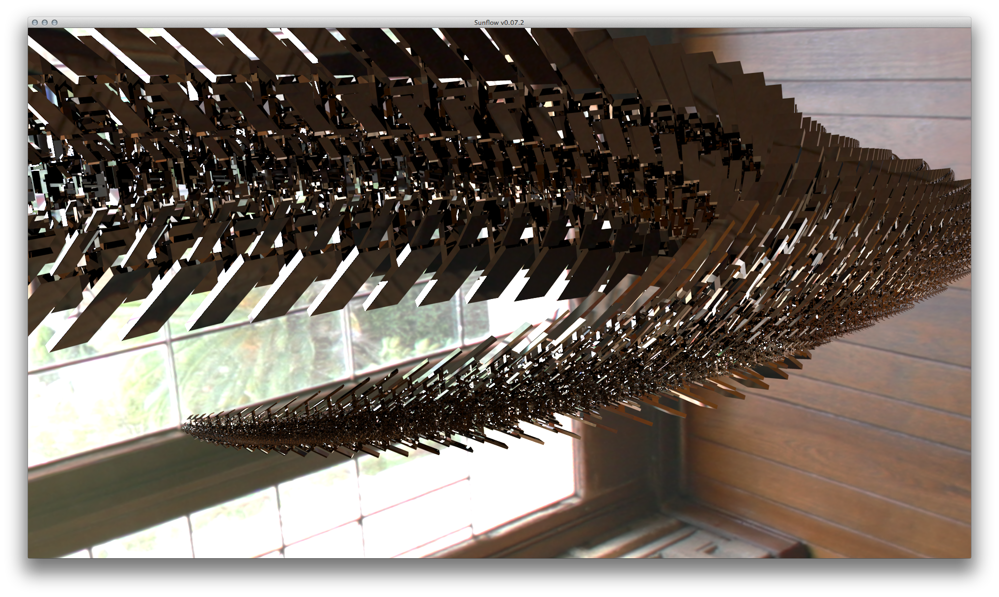 This was an attempt at procedural geometry creation using the open source Sunflow Renderer, which is available as a library for Processing. I manually programmed the transformations of the geometry, and then created renders using Sunflow. Some of the results were pretty stunning! I was annoyed that the Processing openGL and Sunflow cameras never seemed to exactly agree, and it was hard to predict exact what the eventual render would look like....