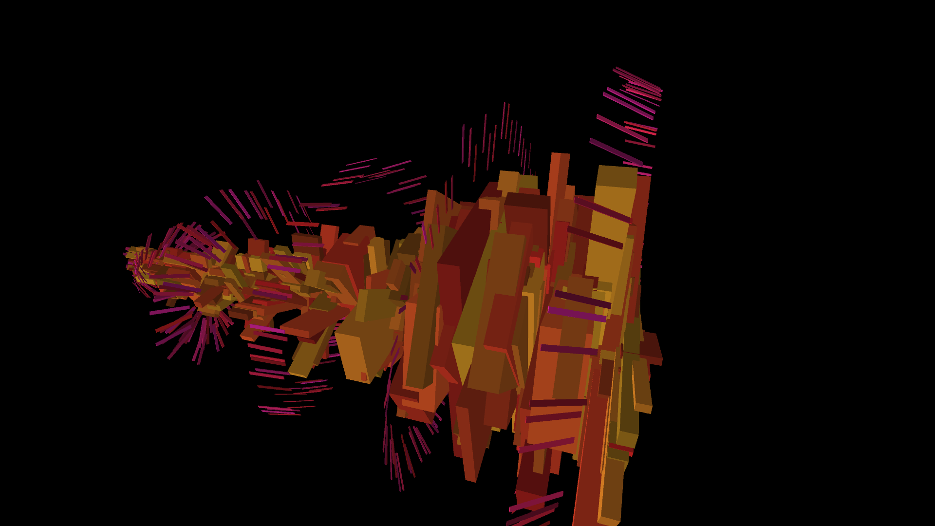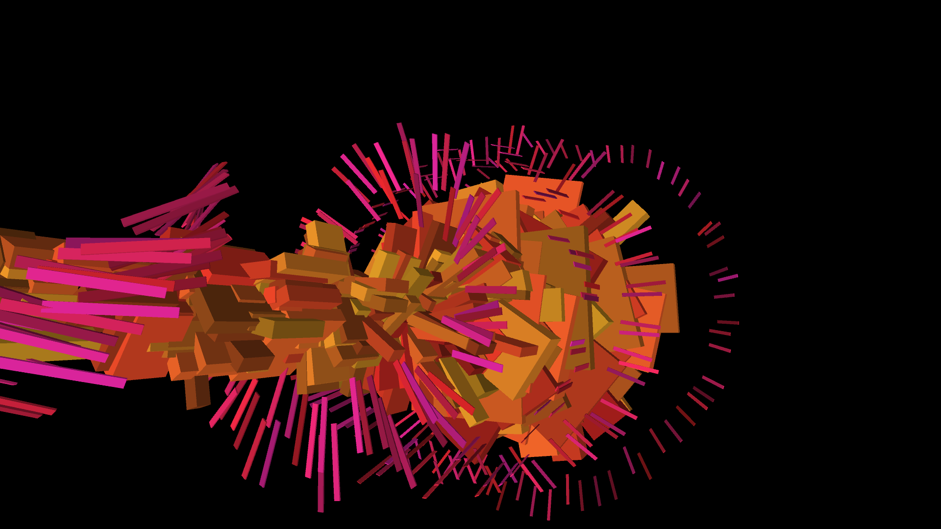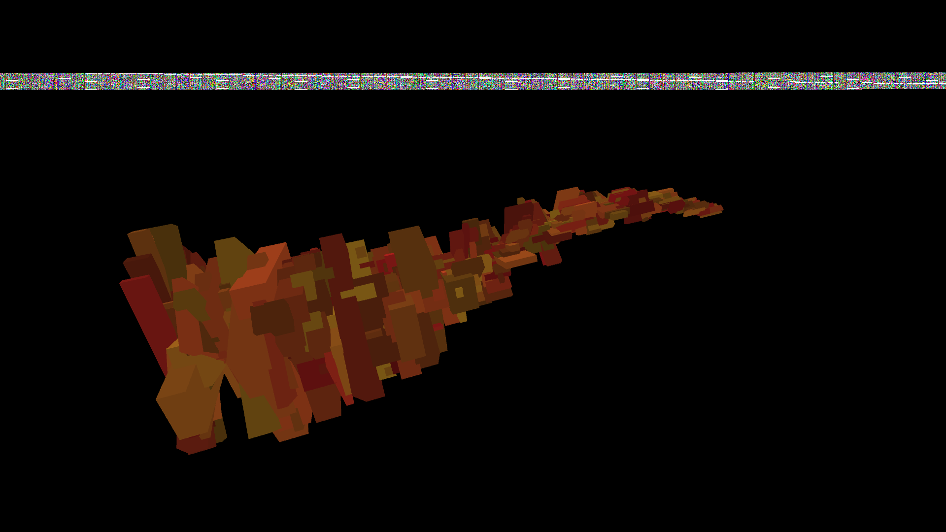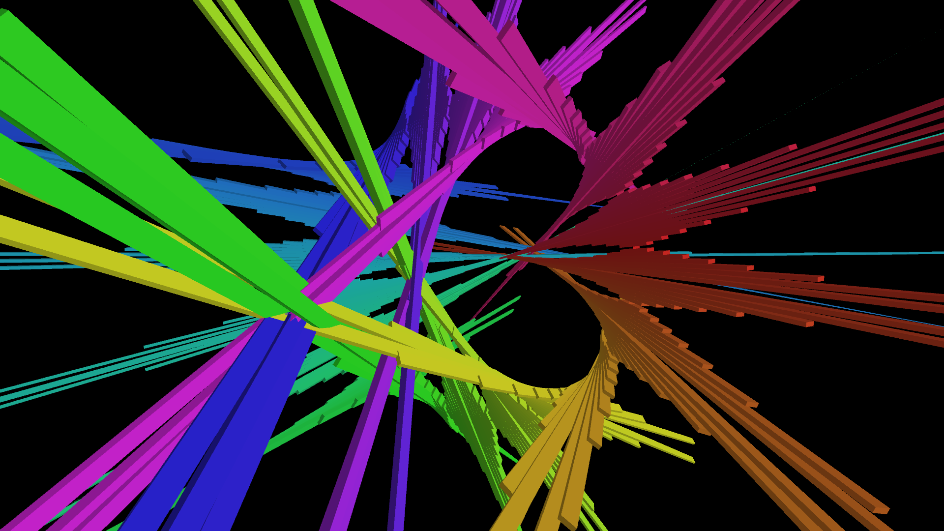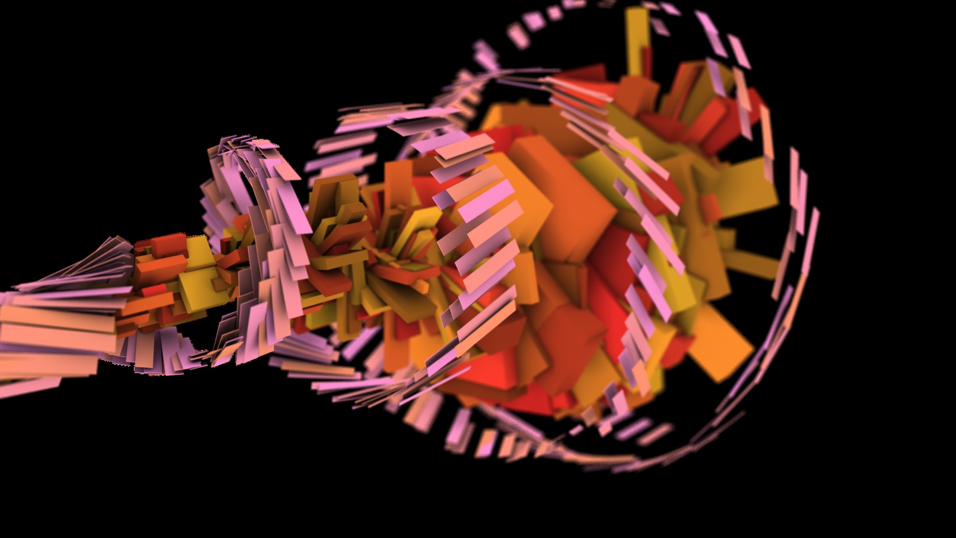 These stills are framegrabs from a music visualizer I wrote for Soundcheck. Since I had separate channels straight from the mixing board, I was given unprecedented access to the individual instruments that made up the tracks. Each instrument was visualized with a different color and ruleset.